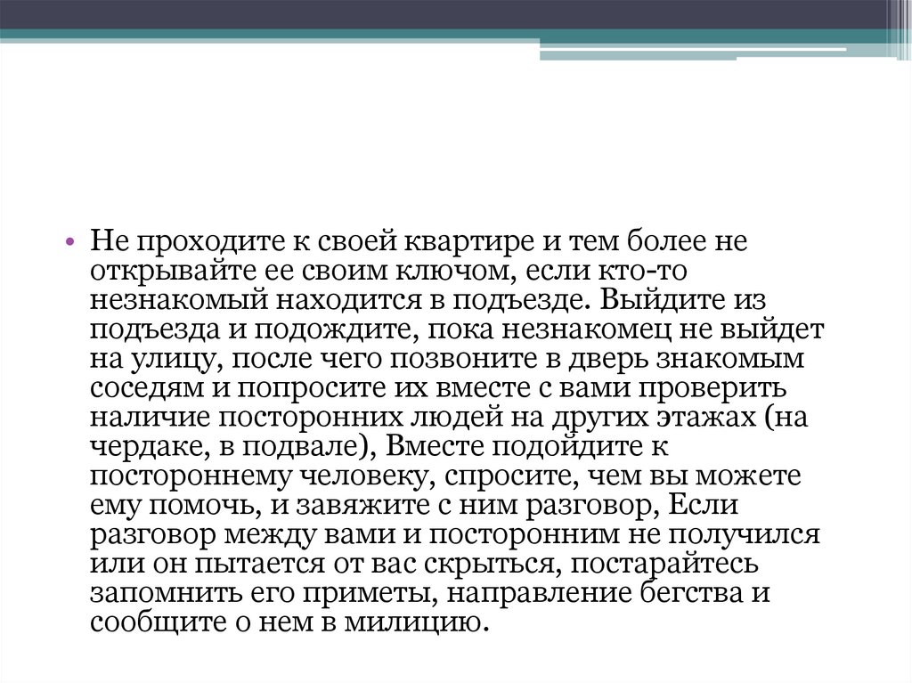 • Не проходите к своей квартире и тем более неоткрывайте ее своим ключом, если кто-то