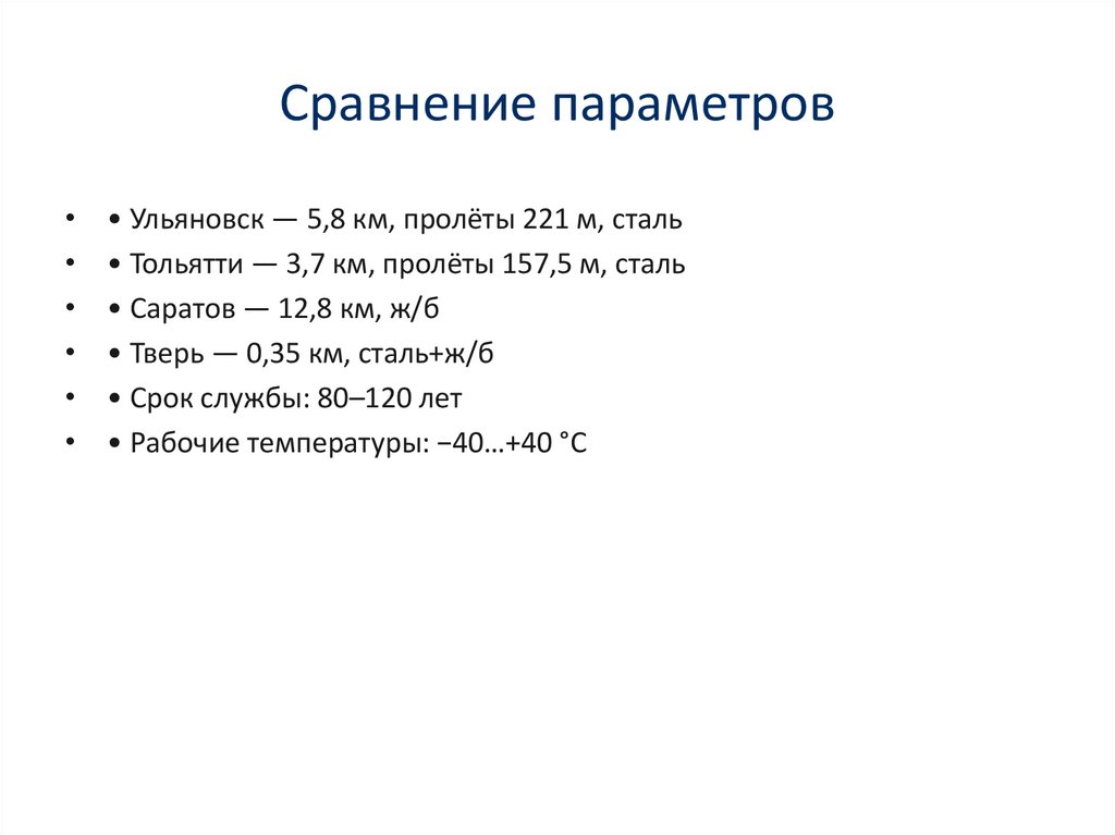 Сравнение параметров• Ульяновск — 5,8 км, пролёты 221 м, сталь