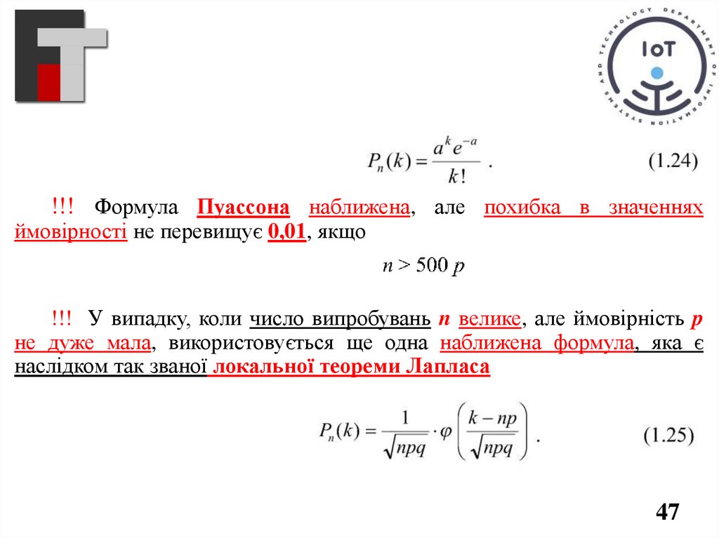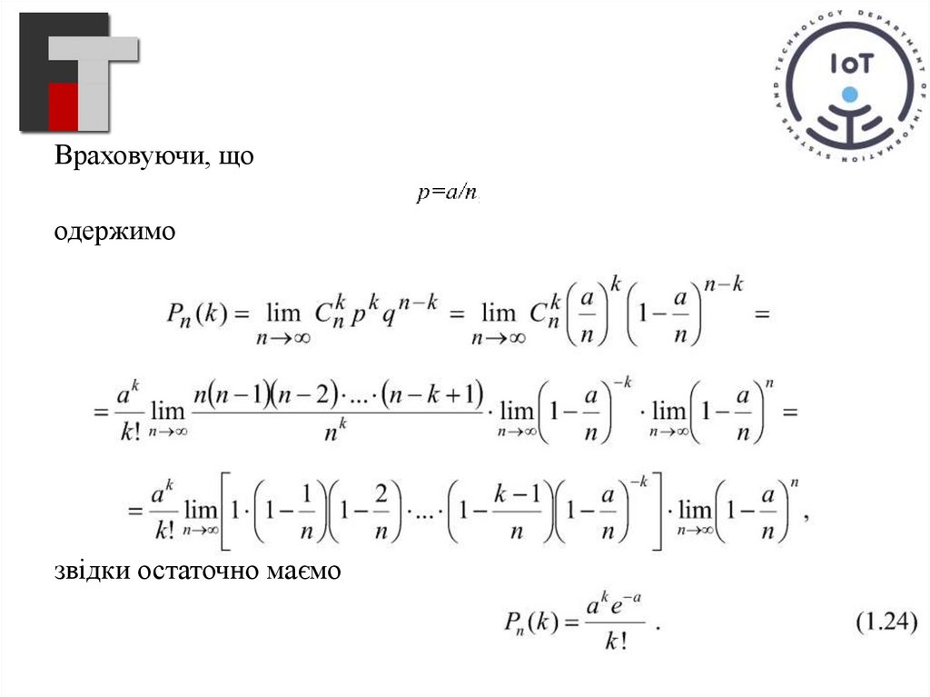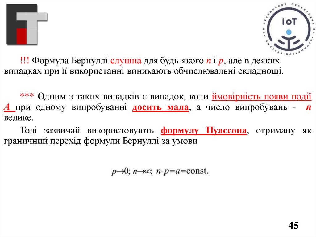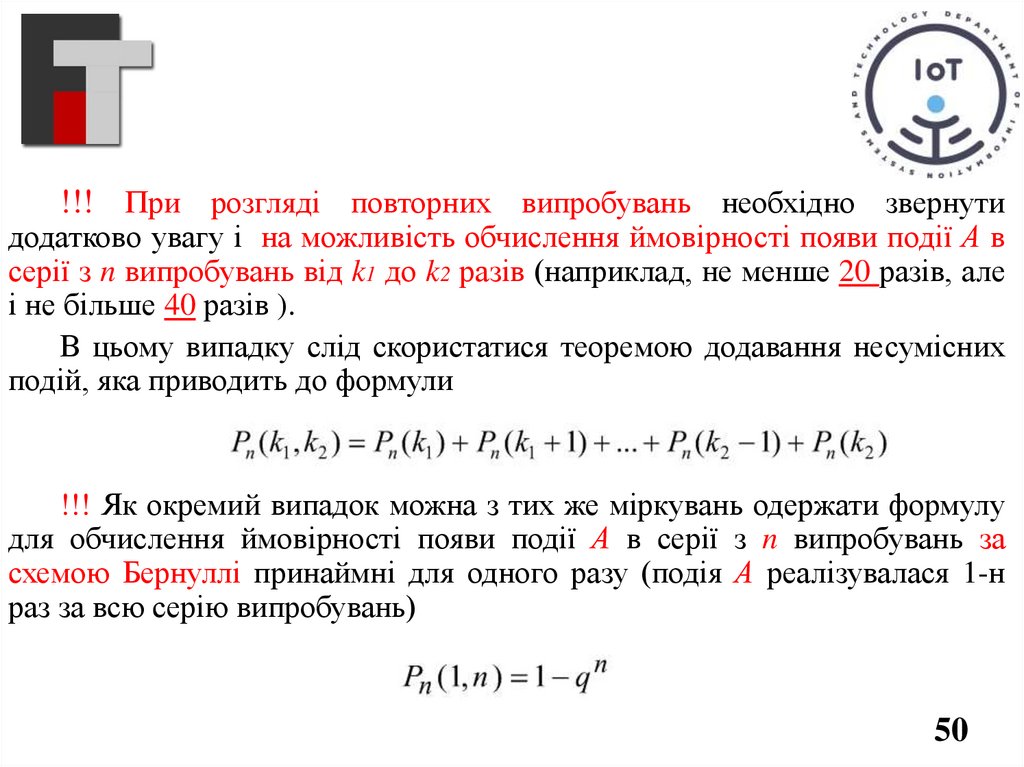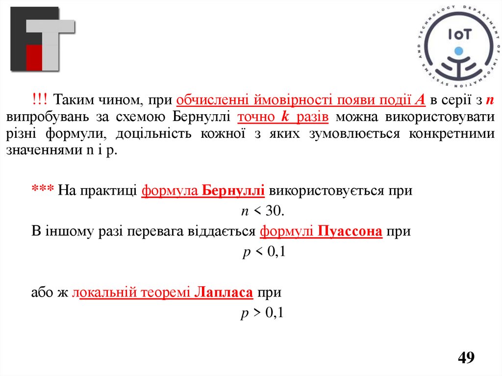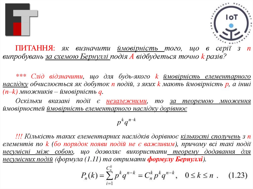 !!! Таким чином, при обчисленні ймовірності появи події А в серії з nвипробувань за схемою Бернуллі точно k разів можна використовувати