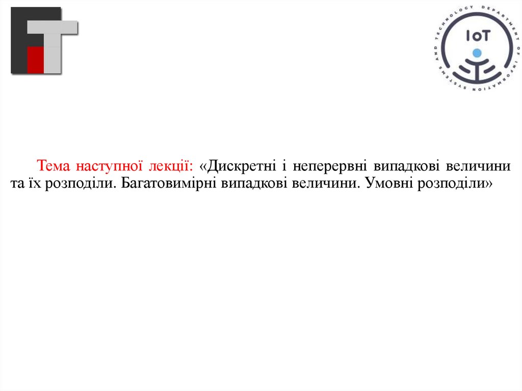 Тема наступної лекції: «Дискретні і неперервні випадкові величинита їх розподіли. Багатовимірні випадкові величини. Умовні розподіли»