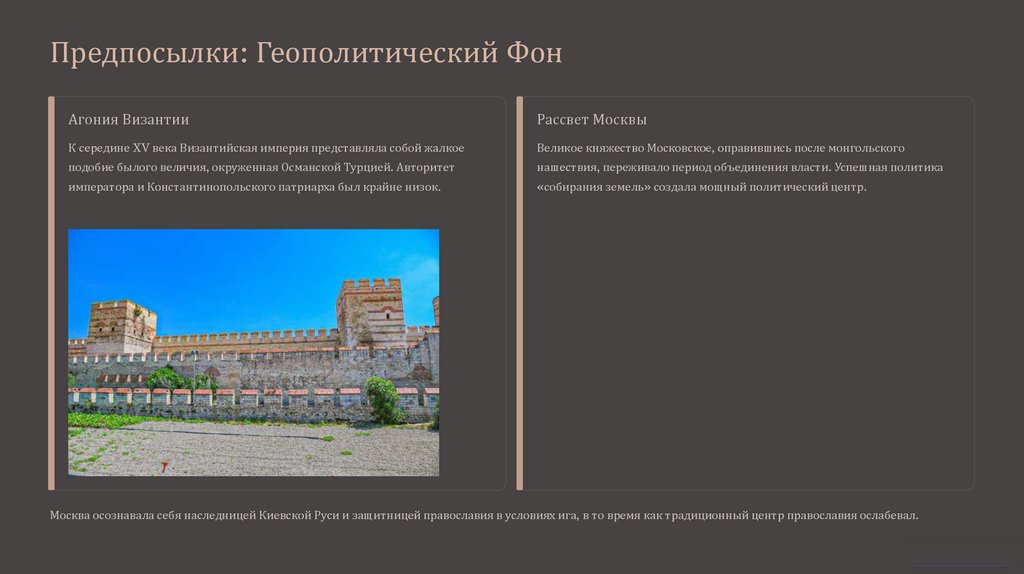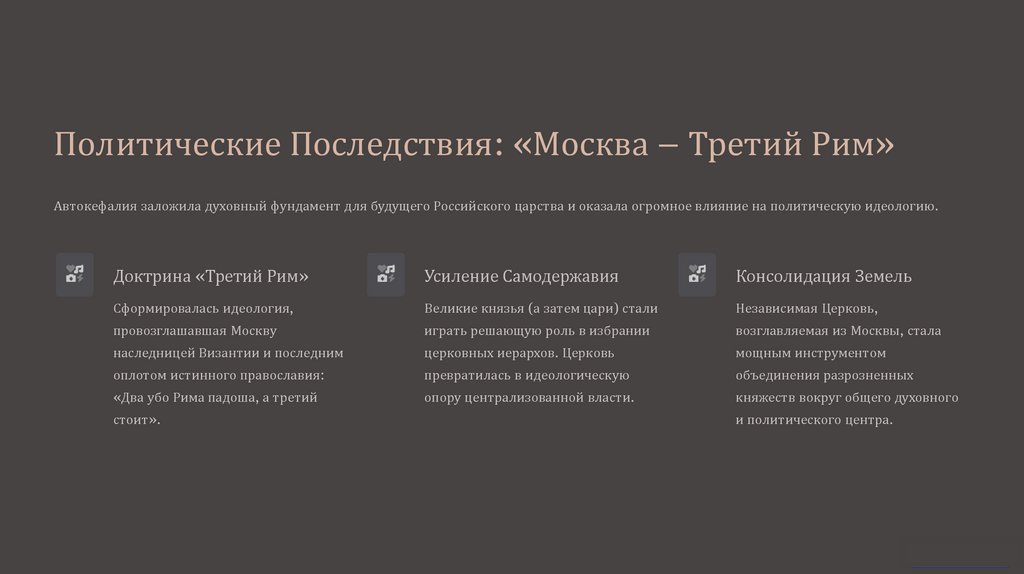 Политические Последствия: «Москва – Третий Рим»Автокефалия заложила духовный фундамент для будущего Российского царства и оказала огромное влияние на политическую идеологию.