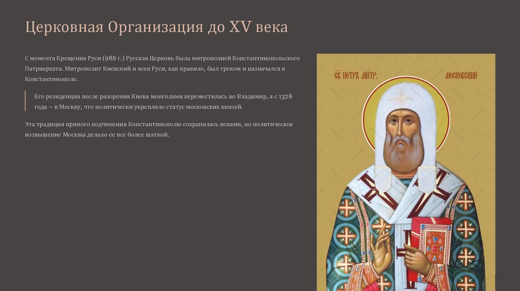 Церковная Организация до XV векаС момента Крещения Руси (988 г.) Русская Церковь была митрополией Константинопольского