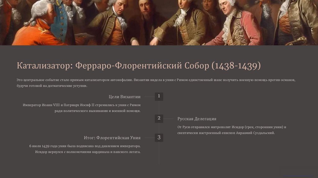 Катализатор: Ферраро-Флорентийский Собор (1438-1439)Это центральное событие стало прямым катализатором автокефалии. Византия видела в унии с Римом единственный шанс получить военную помощь против османов,