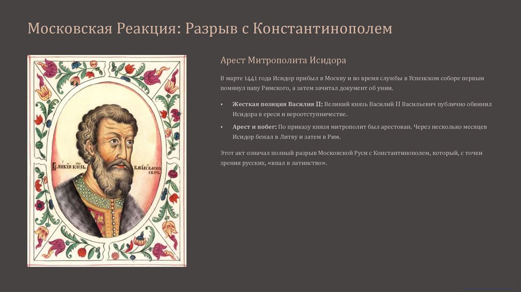 Московская Реакция: Разрыв с КонстантинополемАрест Митрополита Исидора