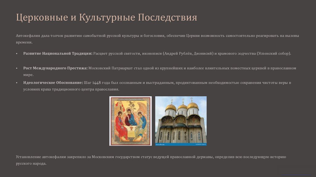 Церковные и Культурные ПоследствияАвтокефалия дала толчок развитию самобытной русской культуры и богословия, обеспечив Церкви возможность самостоятельно реагировать на вызовы