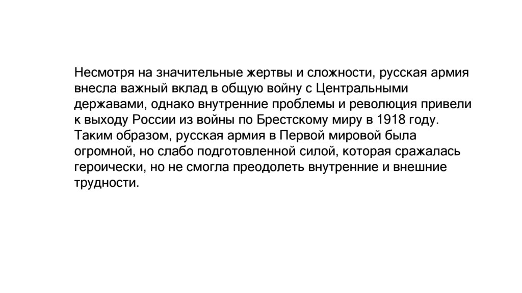 Несмотря на значительные жертвы и сложности, русская армиявнесла важный вклад в общую войну с Центральными