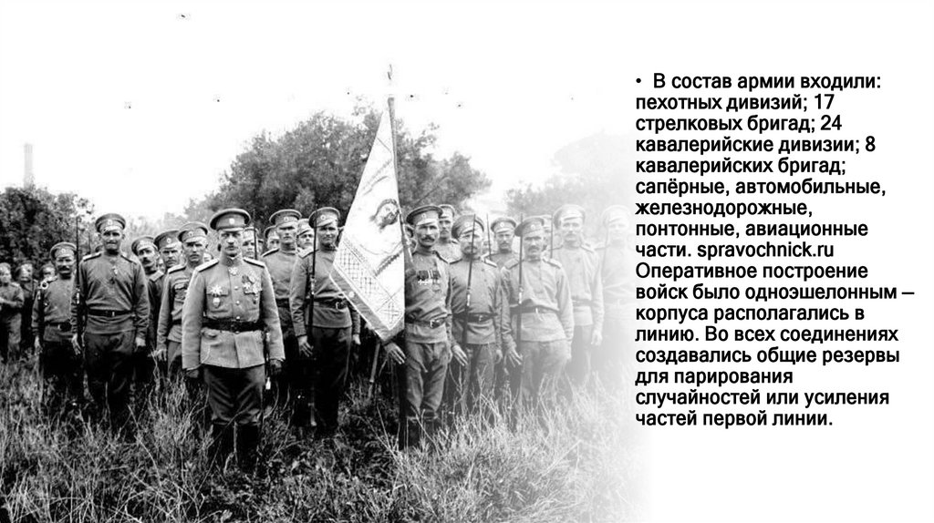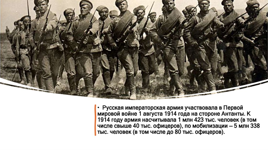 • Русская императорская армия участвовала в Первоймировой войне 1 августа 1914 года на стороне Антанты. К