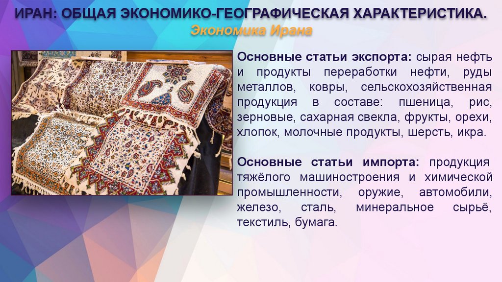 экспорту (нефть 80%, ковры, фрукты,