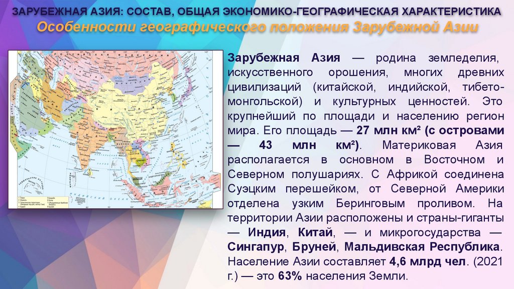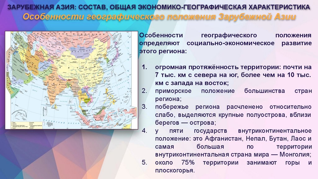 ЗАРУБЕЖНАЯ АЗИЯ: СОСТАВ, ОБЩАЯ ЭКОНОМИКО-ГЕОГРАФИЧЕСКАЯ ХАРАКТЕРИСТИКАОсобенности географического положения Зарубежной Азии