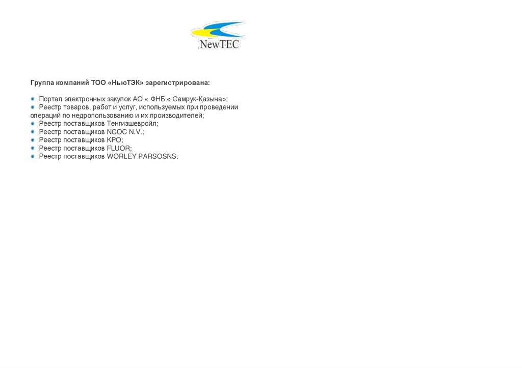 Группа компаний ТОО «НьюТЭК» зарегистрирована:Портал электронных закупок АО « ФНБ « Самрук-Қазына»;