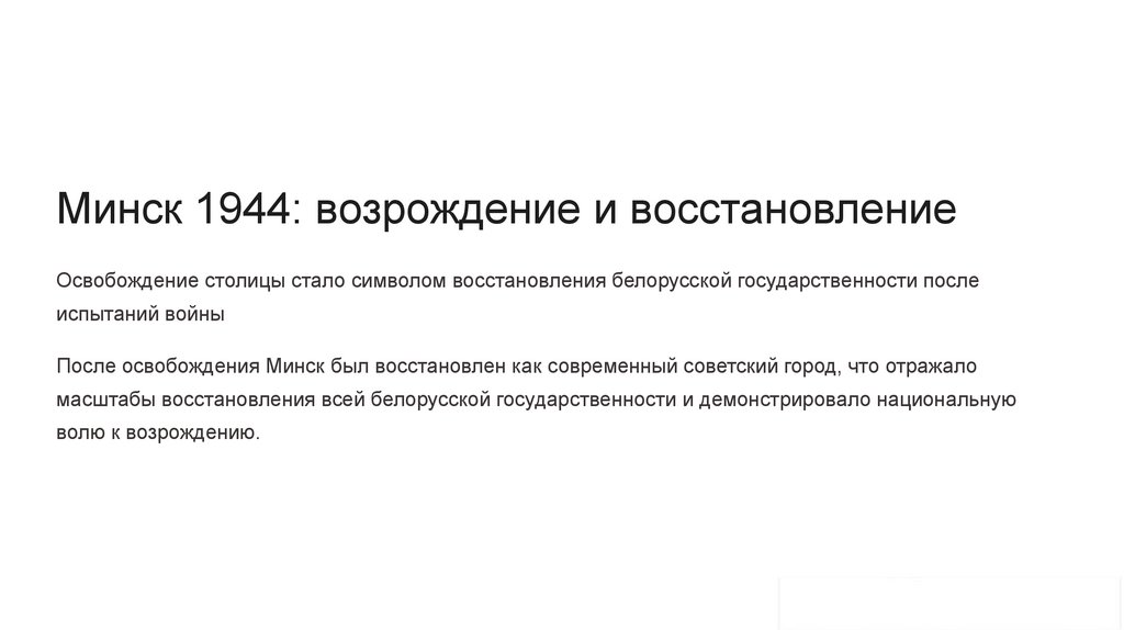 Минск 1944: возрождение и восстановлениеОсвобождение столицы стало символом восстановления белорусской государственности после