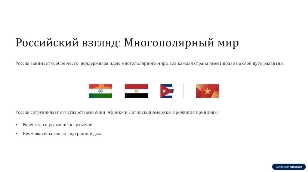 Российский взгляд: Многополярный мирРоссия занимает особое место, поддерживая идею многополярного мира, где каждая страна имеет право на свой путь развития.