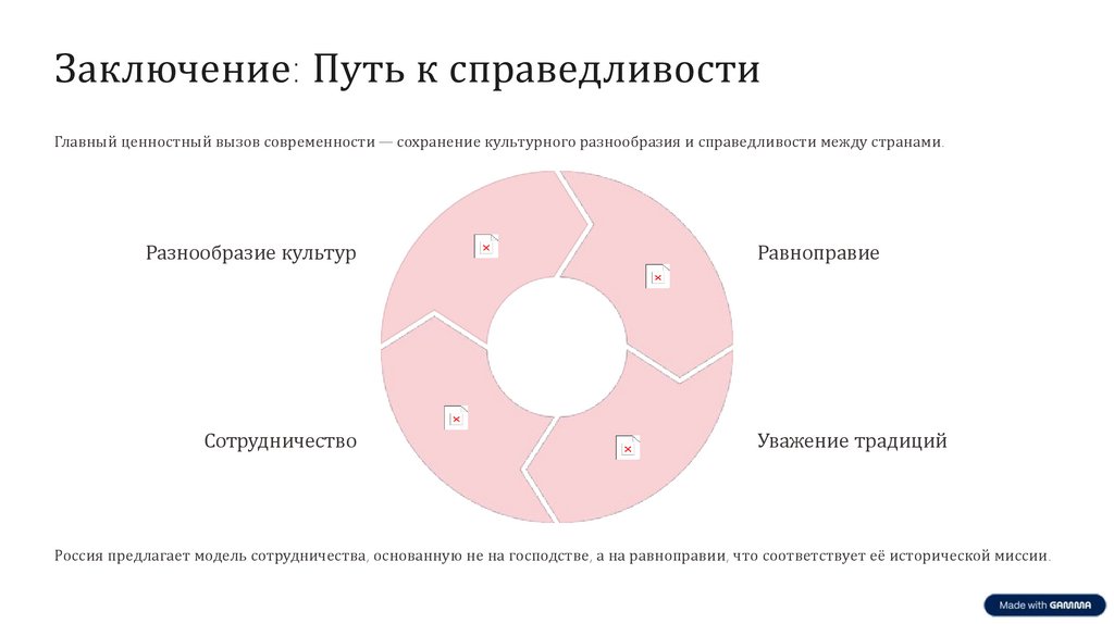 Заключение: Путь к справедливостиГлавный ценностный вызов современности — сохранение культурного разнообразия и справедливости между странами.