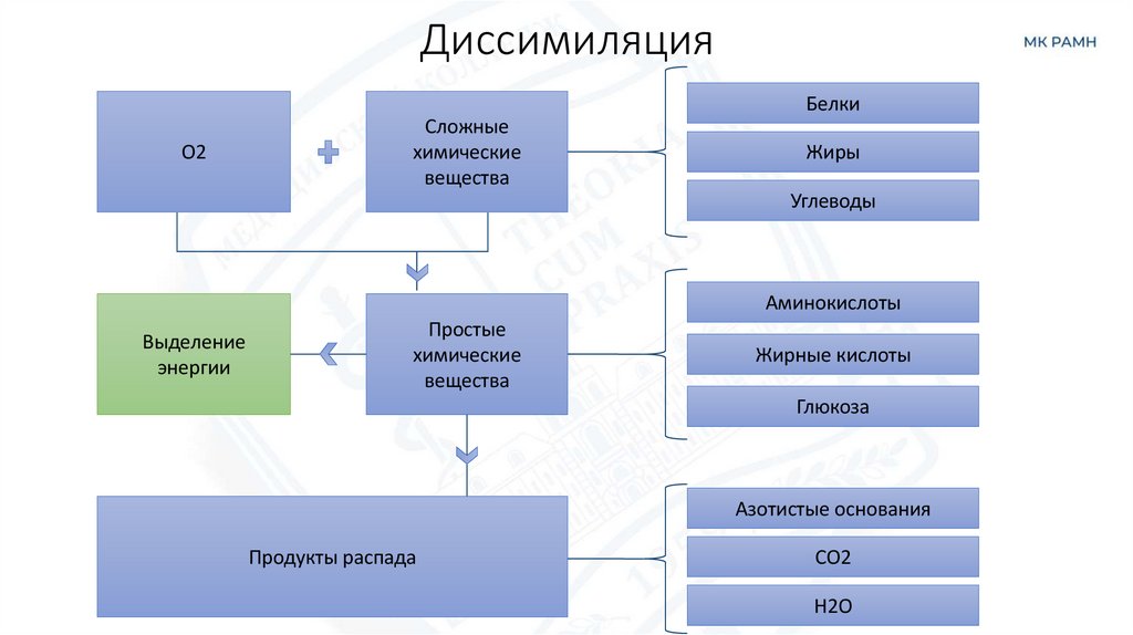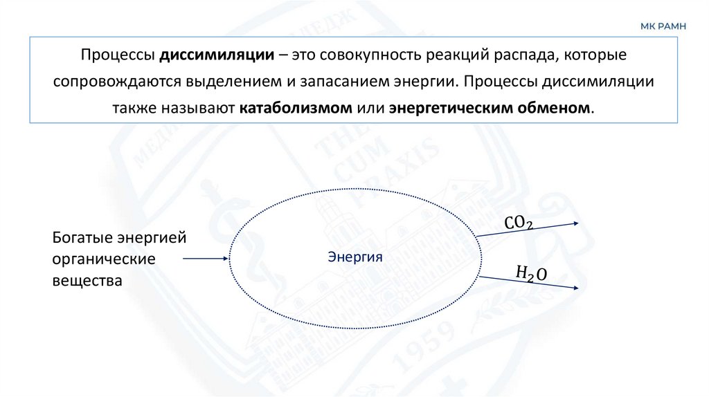 Процессы диссимиляции – это совокупность реакций распада, которыесопровождаются выделением и запасанием энергии. Процессы диссимиляции