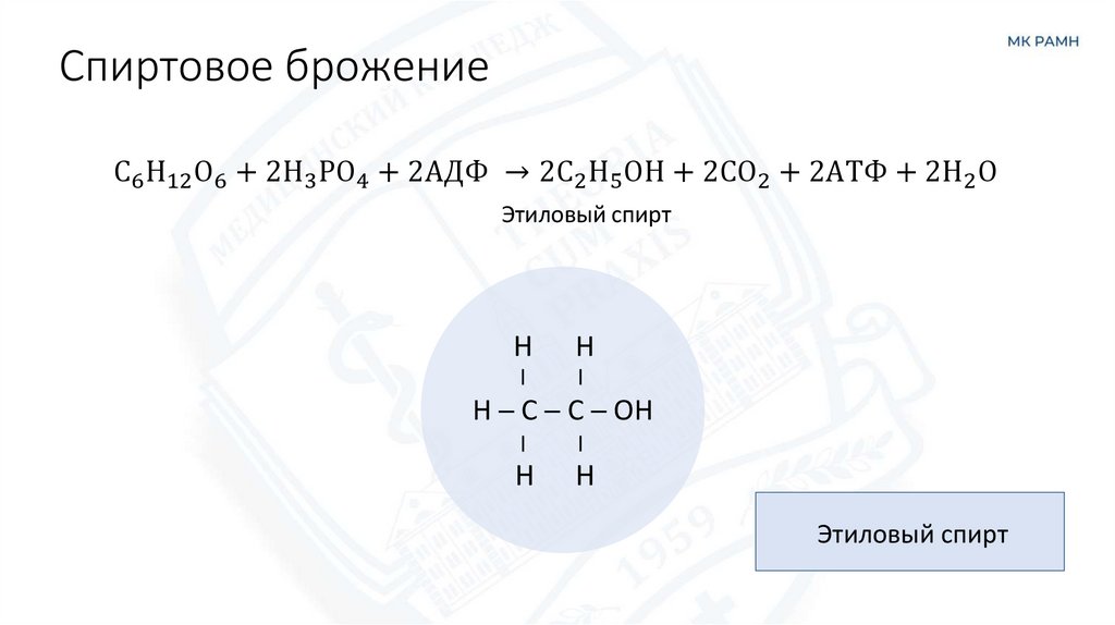 Спиртовое брожениеC6 Н12 О6 + 2Н3 РО4 + 2АДФ → 2С2 Н5 OH + 2CO2 + 2АТФ + 2Н2 О