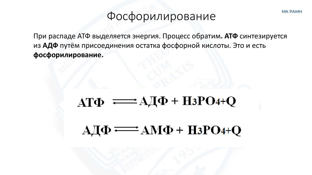 ФосфорилированиеПри распаде АТФ выделяется энергия. Процесс обратим. АТФ синтезируется