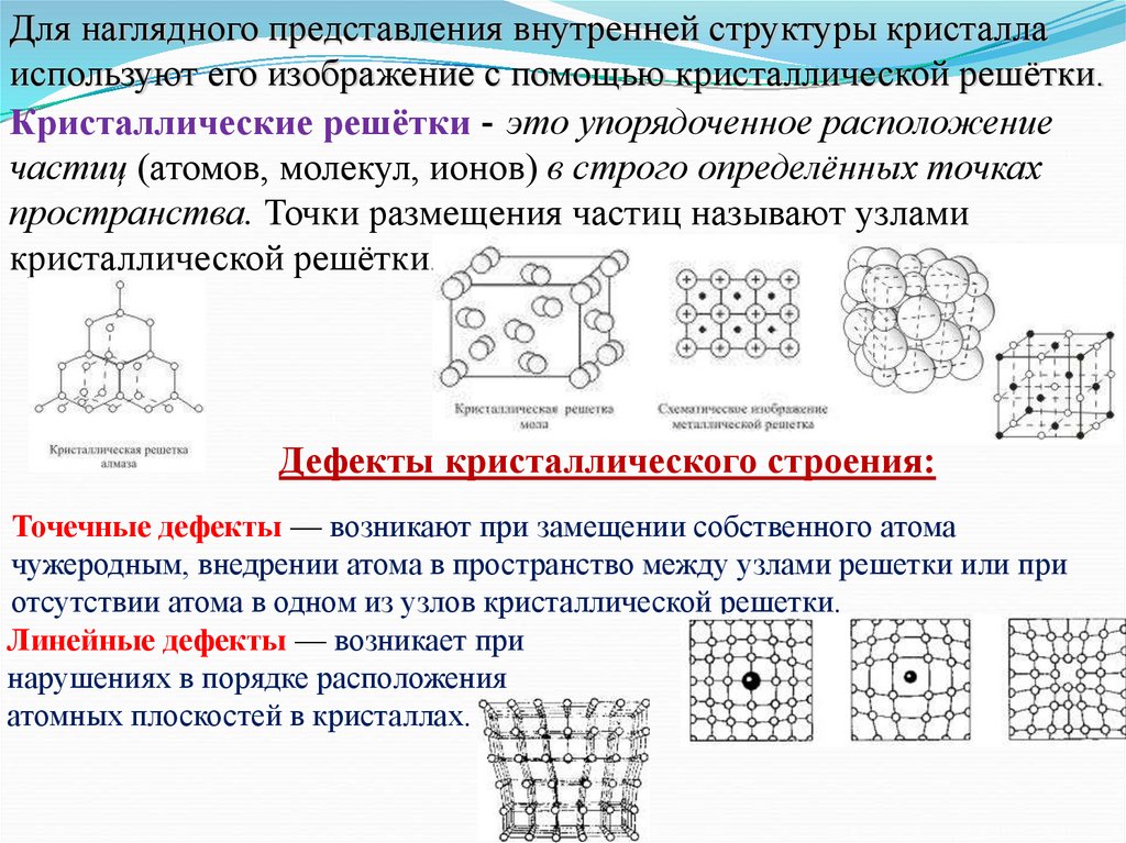 Для наглядного представления внутренней структуры кристаллаиспользуют его изображение с помощью кристаллической решётки.