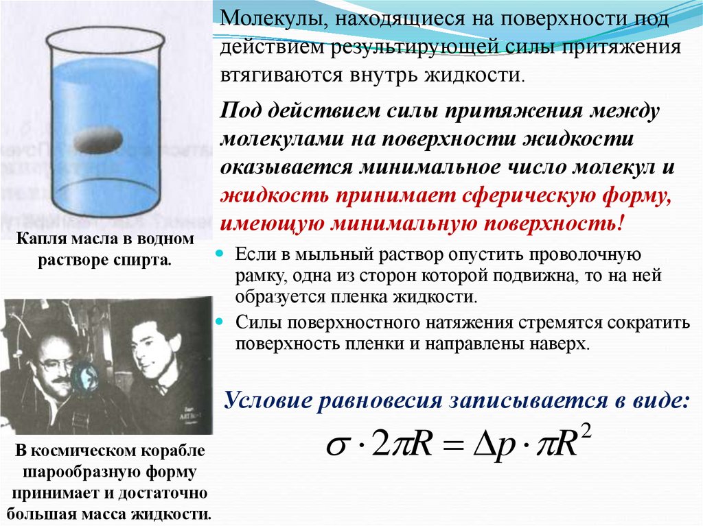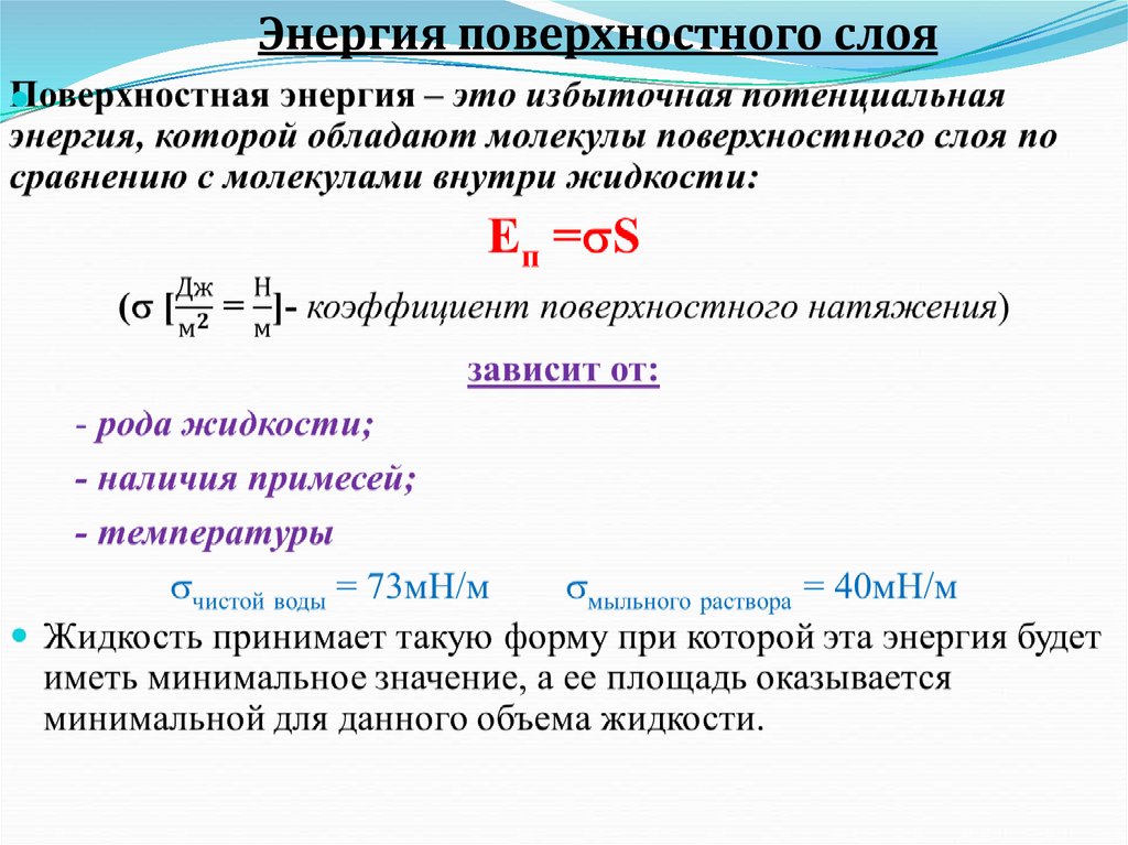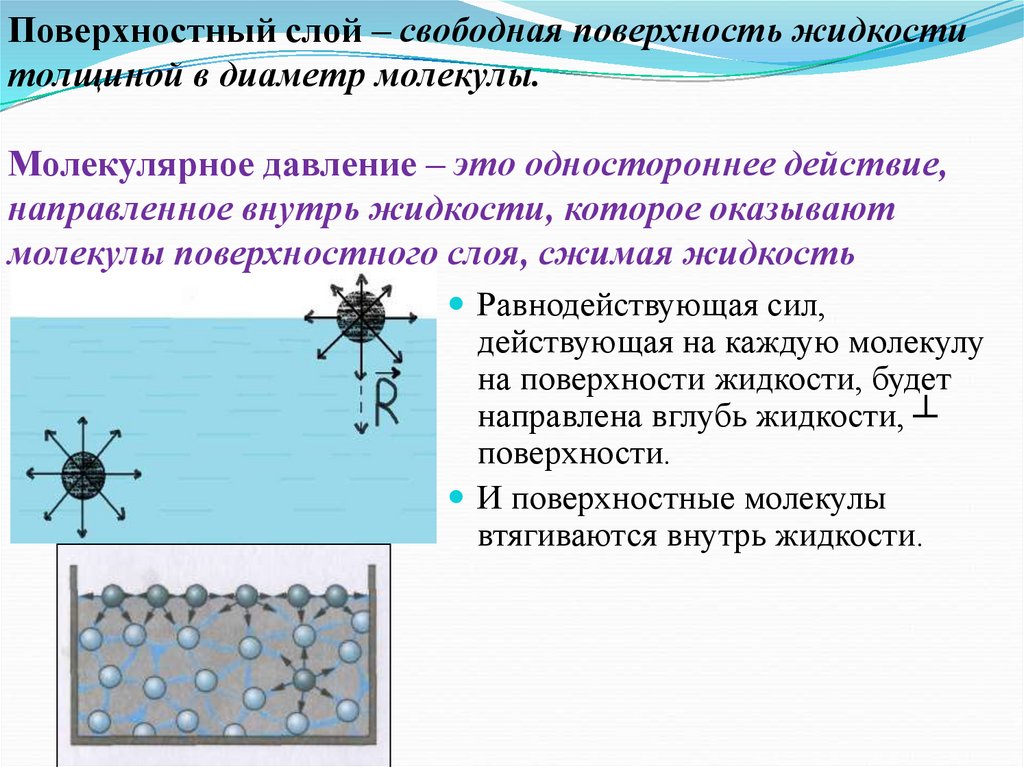 Поверхностное натяжение — явлениемолекулярного давления на жидкость,
