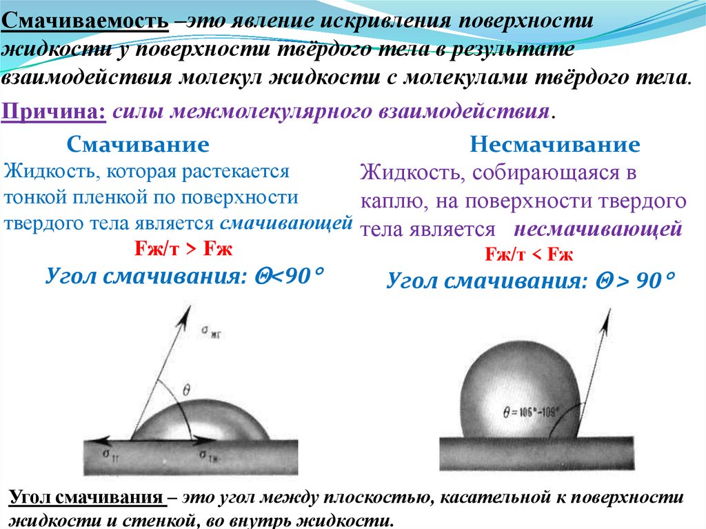 Смачиваемость –это явление искривления поверхностижидкости у поверхности твёрдого тела в результате