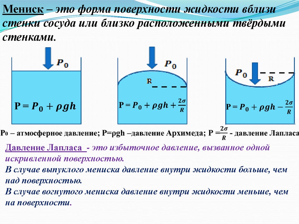 В случае вогнутого мениска давление внутри жидкости меньше, чем