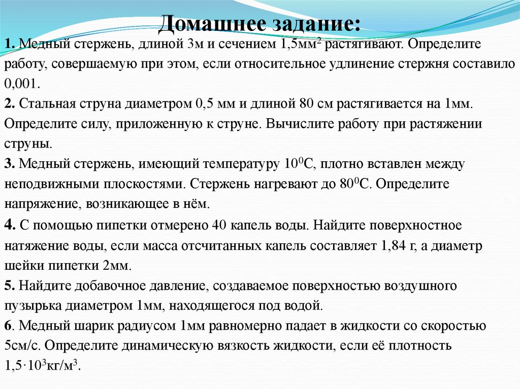 Домашнее задание:1. Медный стержень, длиной 3м и сечением 1,5мм2 растягивают. Определите