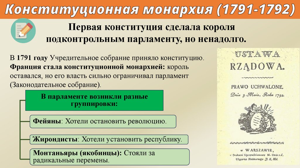 Конституционная монархия (1791-1792)Первая конституция сделала короля