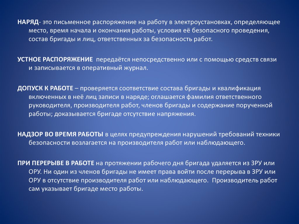 НАРЯД- это письменное распоряжение на работу в электроустановках, определяющееместо, время начала и окончания работы, условия её безопасного проведения,