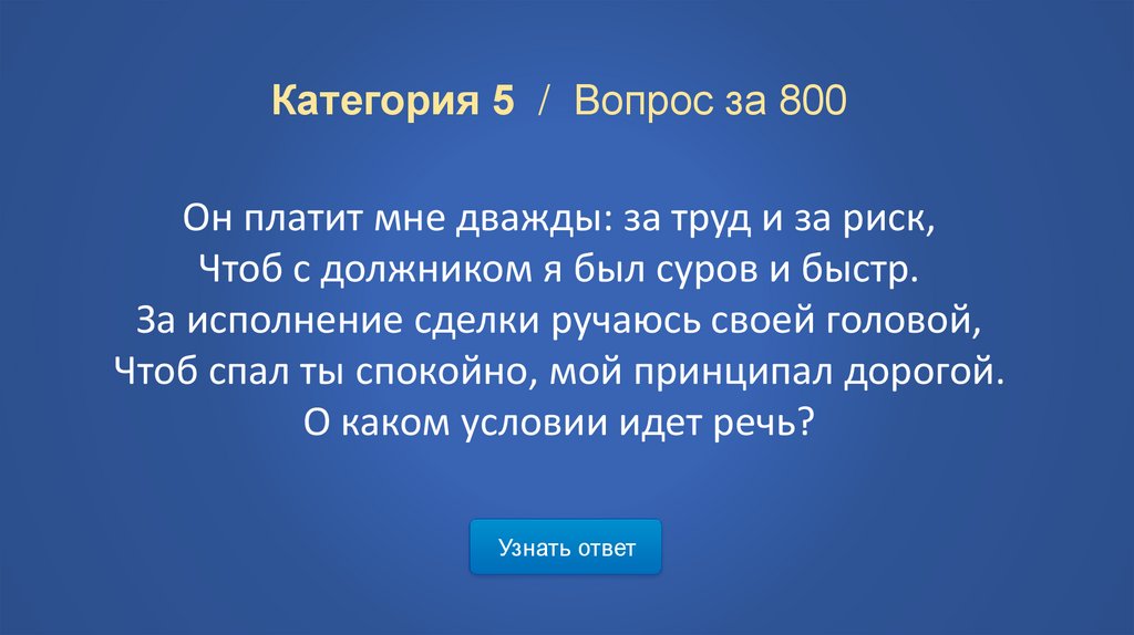Категория 5 / Вопрос за 800Он платит мне дважды: за труд и за риск,