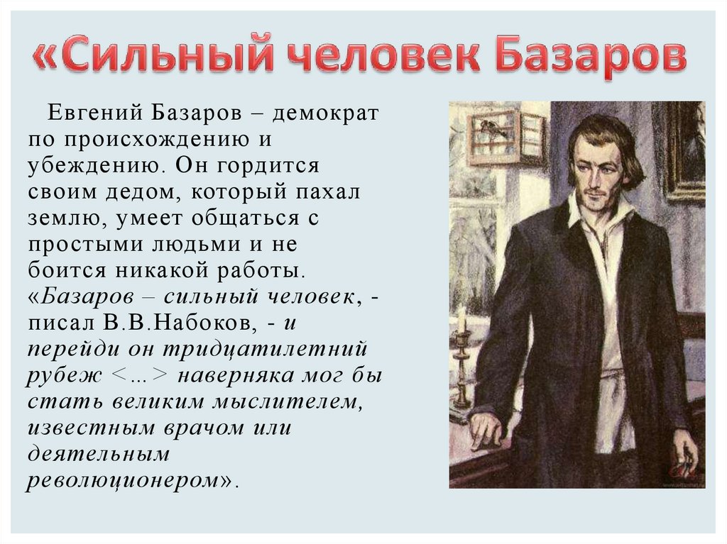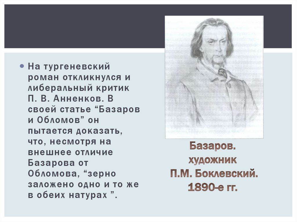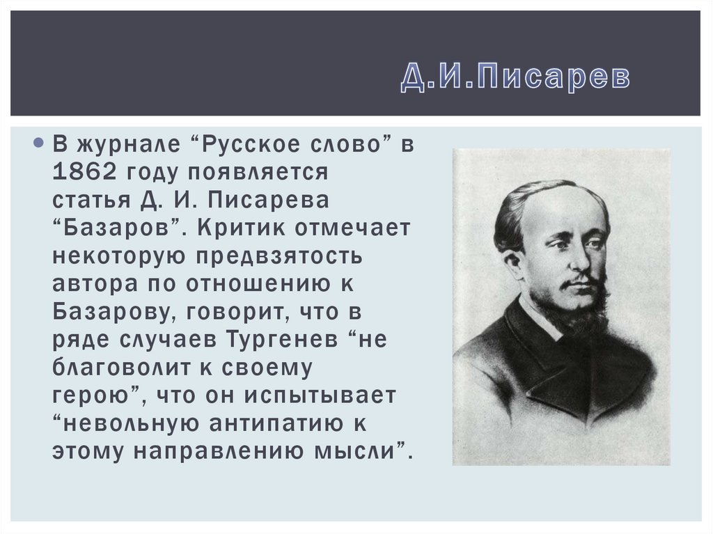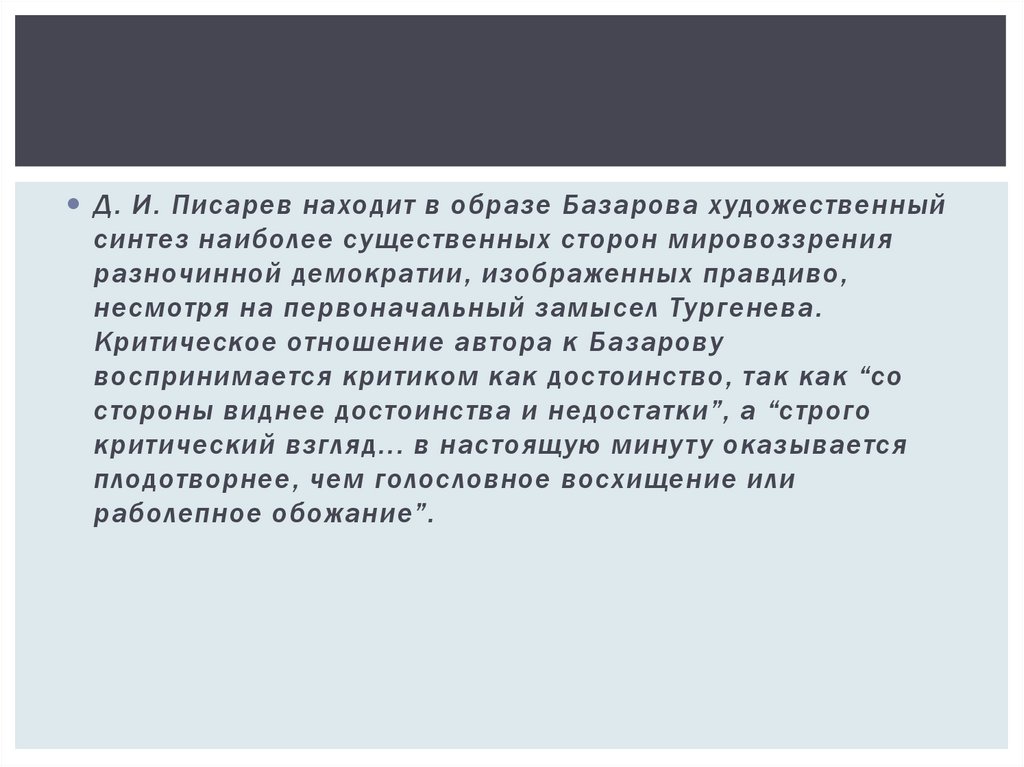 Д. И. Писарев находит в образе Базарова художественныйсинтез наиболее существенных сторон мировоззрения