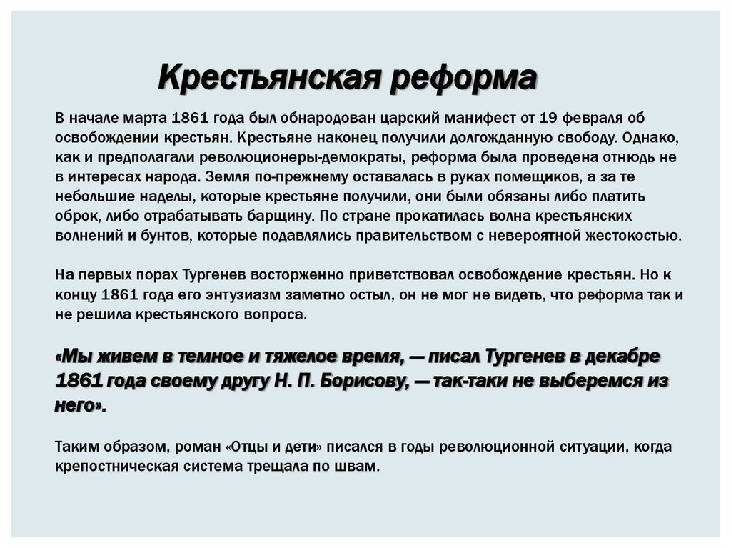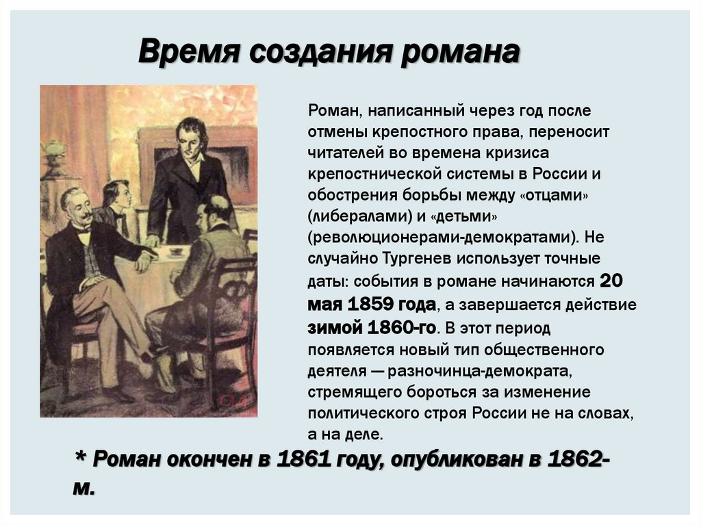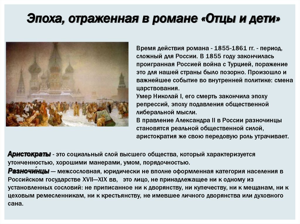 Эпоха, отраженная в романе «Отцы и дети»Время действия романа - 1855-1861 гг. - период,