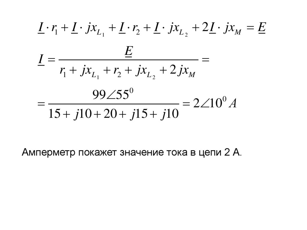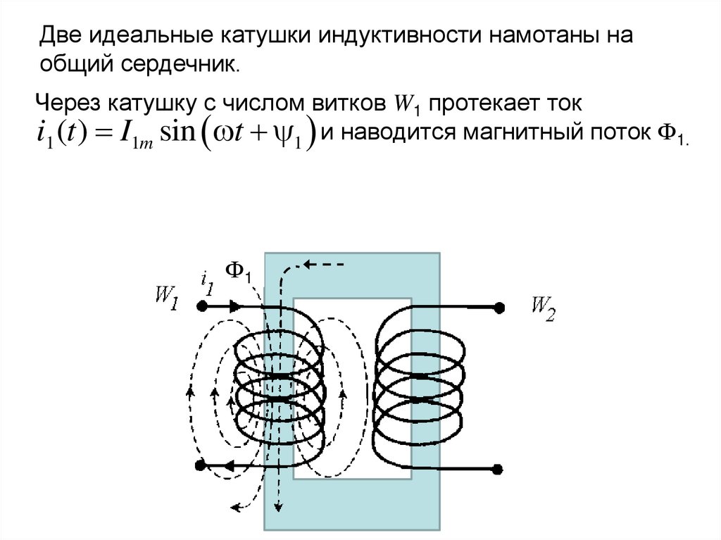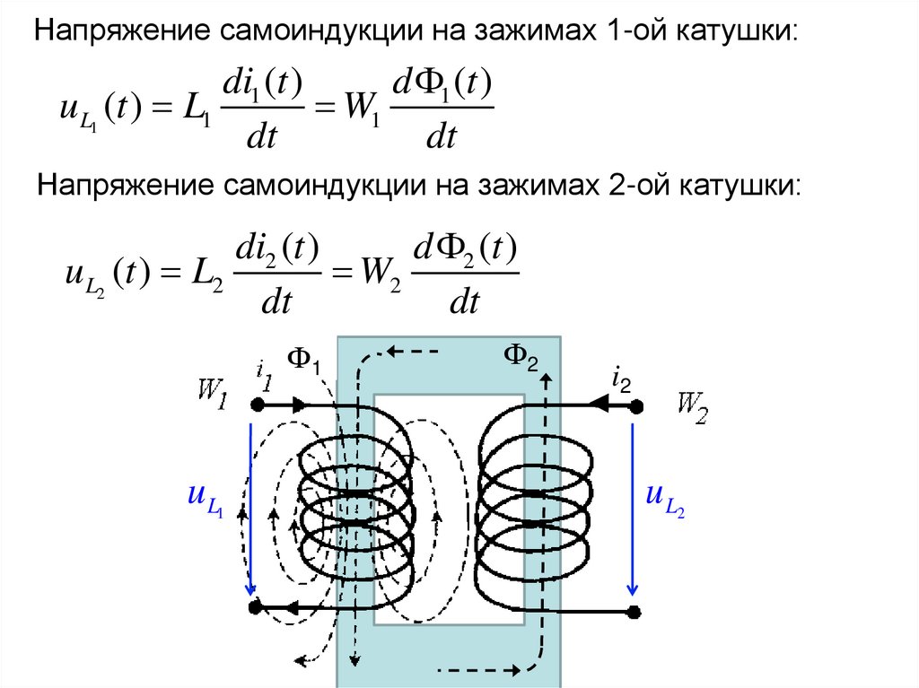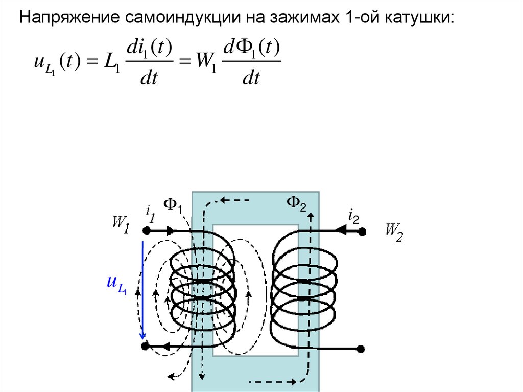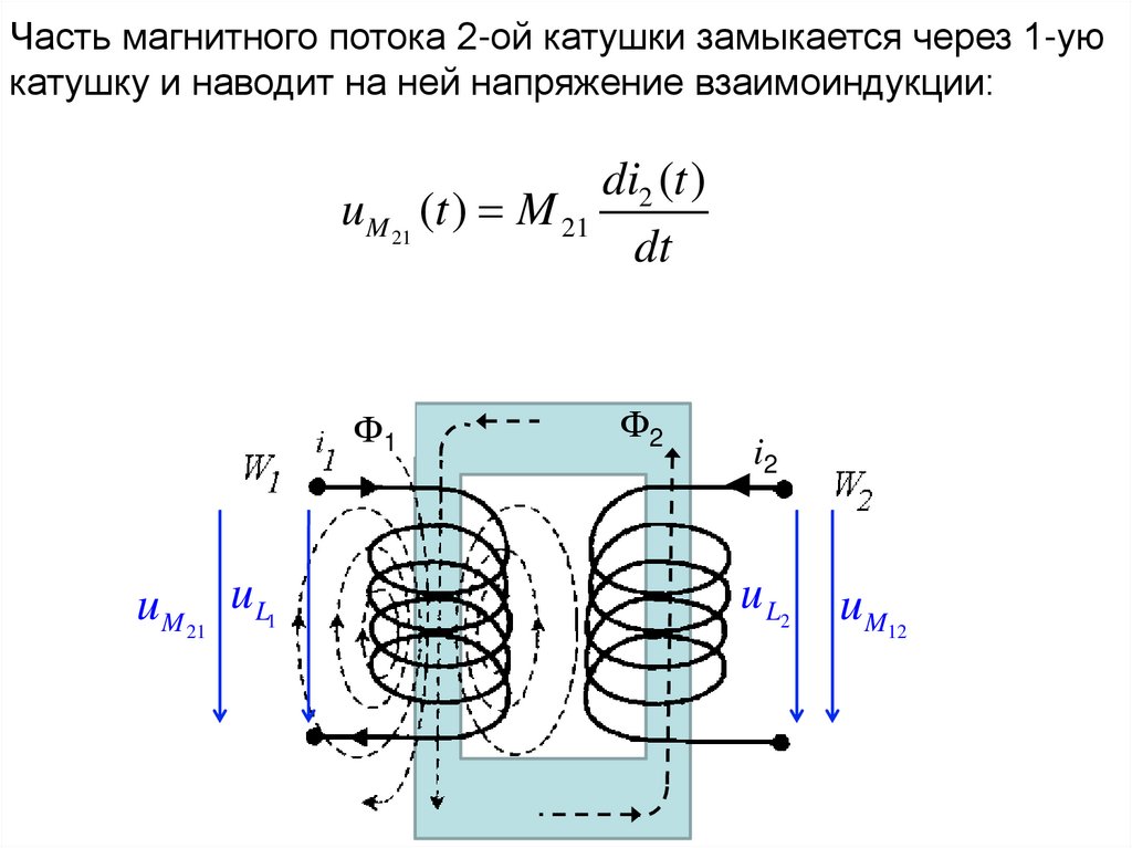 Часть магнитного потока 2-ой катушки замыкается через 1-уюкатушку и наводит на ней напряжение взаимоиндукции: