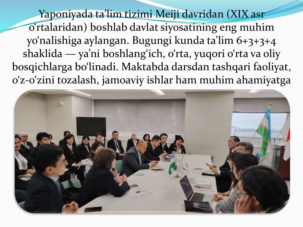 Yaponiyada ta’lim tizimi Meiji davridan (XIX asro‘rtalaridan) boshlab davlat siyosatining eng muhim