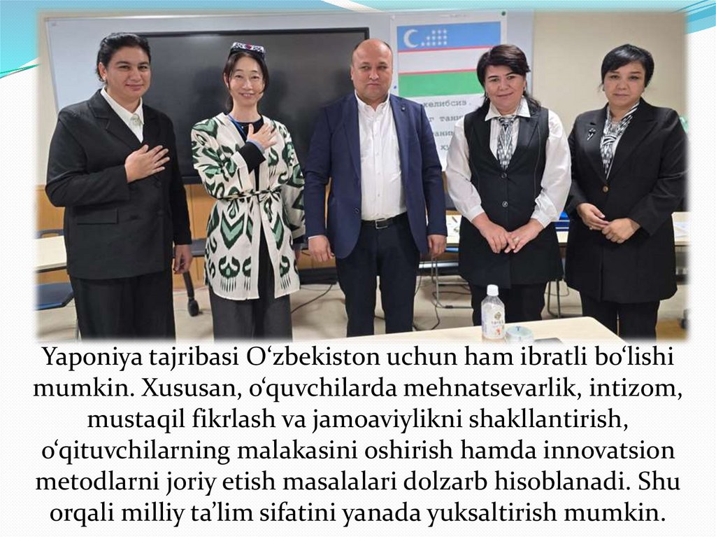 Yaponiya tajribasi O‘zbekiston uchun ham ibratli bo‘lishimumkin. Xususan, o‘quvchilarda mehnatsevarlik, intizom,