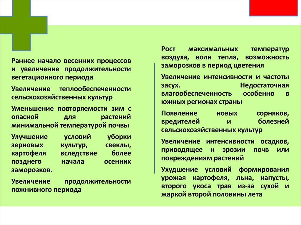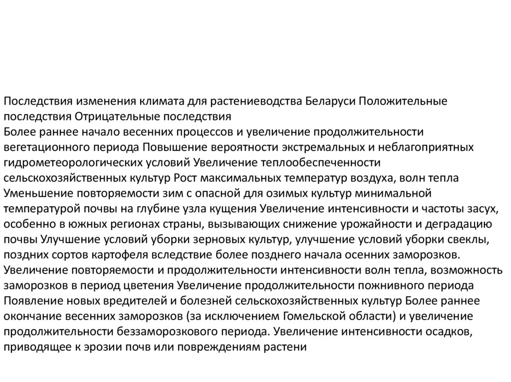 Последствия изменения климата для растениеводства Беларуси Положительныепоследствия Отрицательные последствия