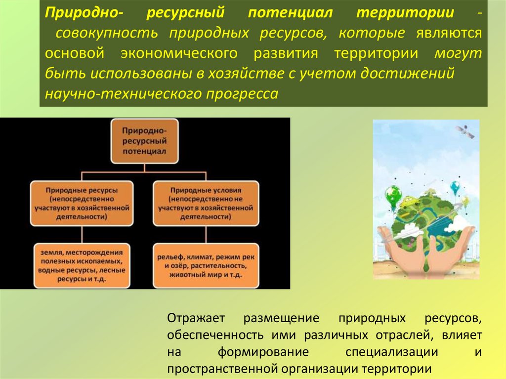 Природно- ресурсный потенциал территории совокупность природных ресурсов, которые являютсяосновой экономического развития территории могут