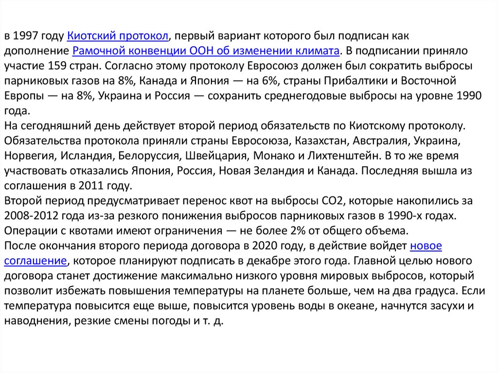 в 1997 году Киотский протокол, первый вариант которого был подписан какдополнение Рамочной конвенции ООН об изменении климата. В подписании приняло