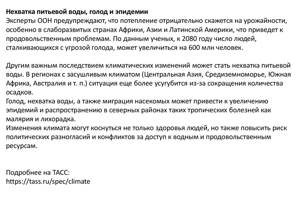 Нехватка питьевой воды, голод и эпидемииЭксперты ООН предупреждают, что потепление отрицательно скажется на урожайности,