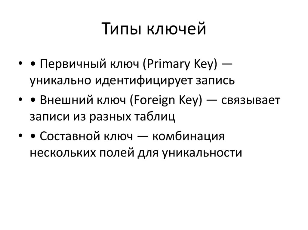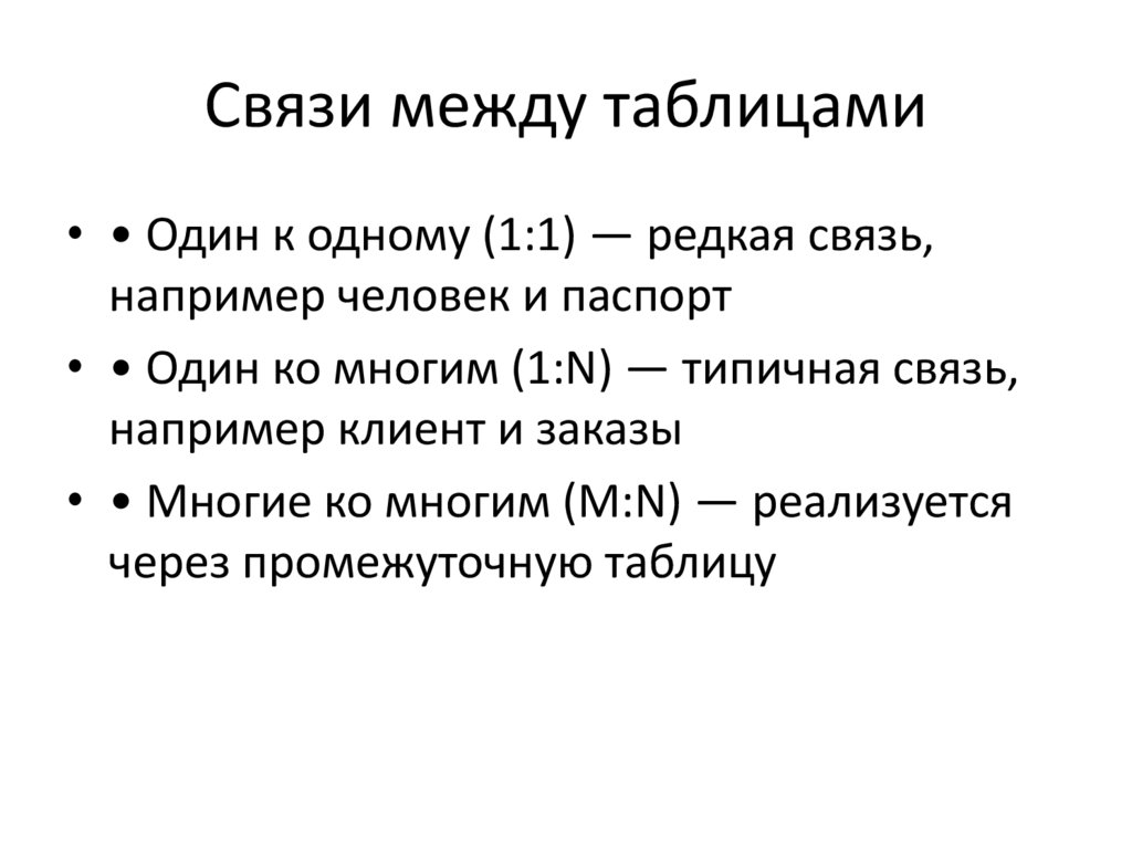 Связи между таблицами• • Один к одному (1:1) — редкая связь,