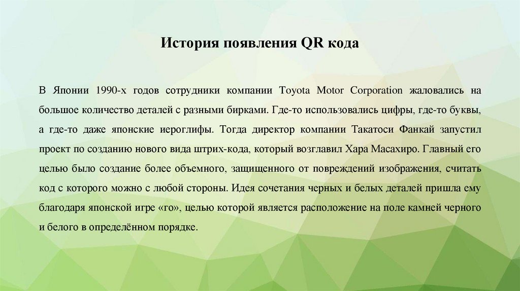 История появления QR кодаВ Японии 1990-х годов сотрудники компании Toyota Motor Corporation жаловались на