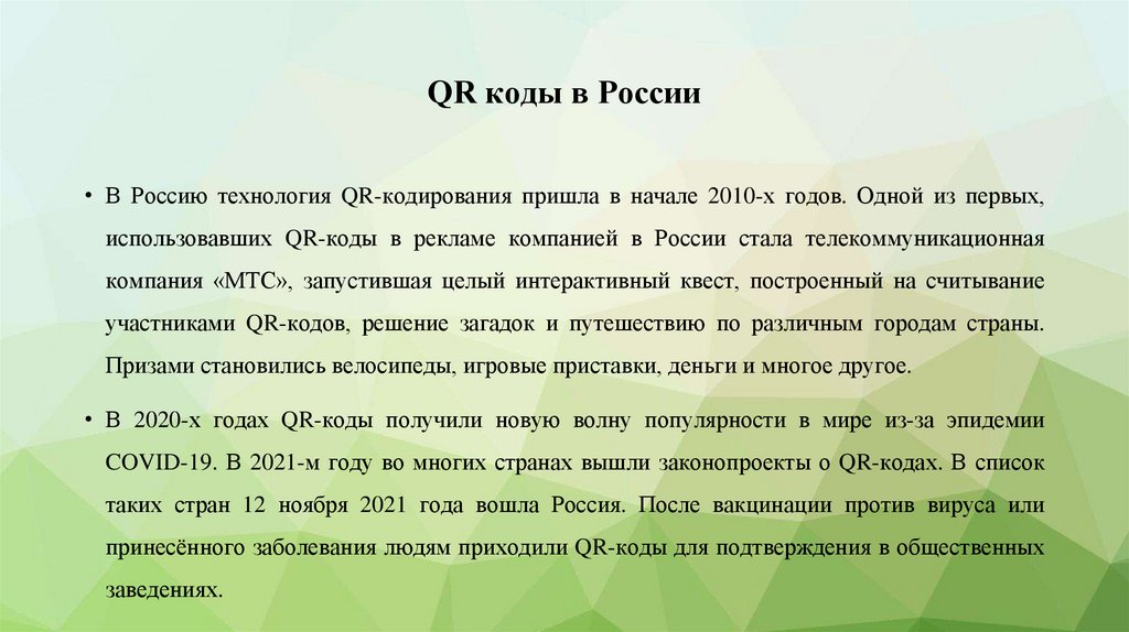 QR коды в России• В Россию технология QR-кодирования пришла в начале 2010-х годов. Одной из первых,