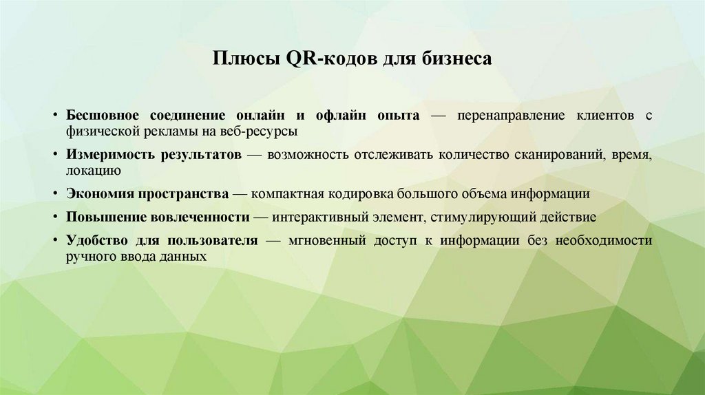 Плюсы QR-кодов для бизнеса• Бесшовное соединение онлайн и офлайн опыта — перенаправление клиентов с