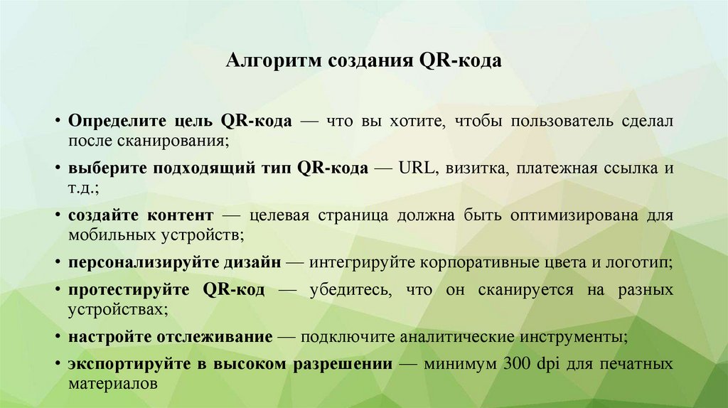 Алгоритм создания QR-кода• Определите цель QR-кода — что вы хотите, чтобы пользователь сделал