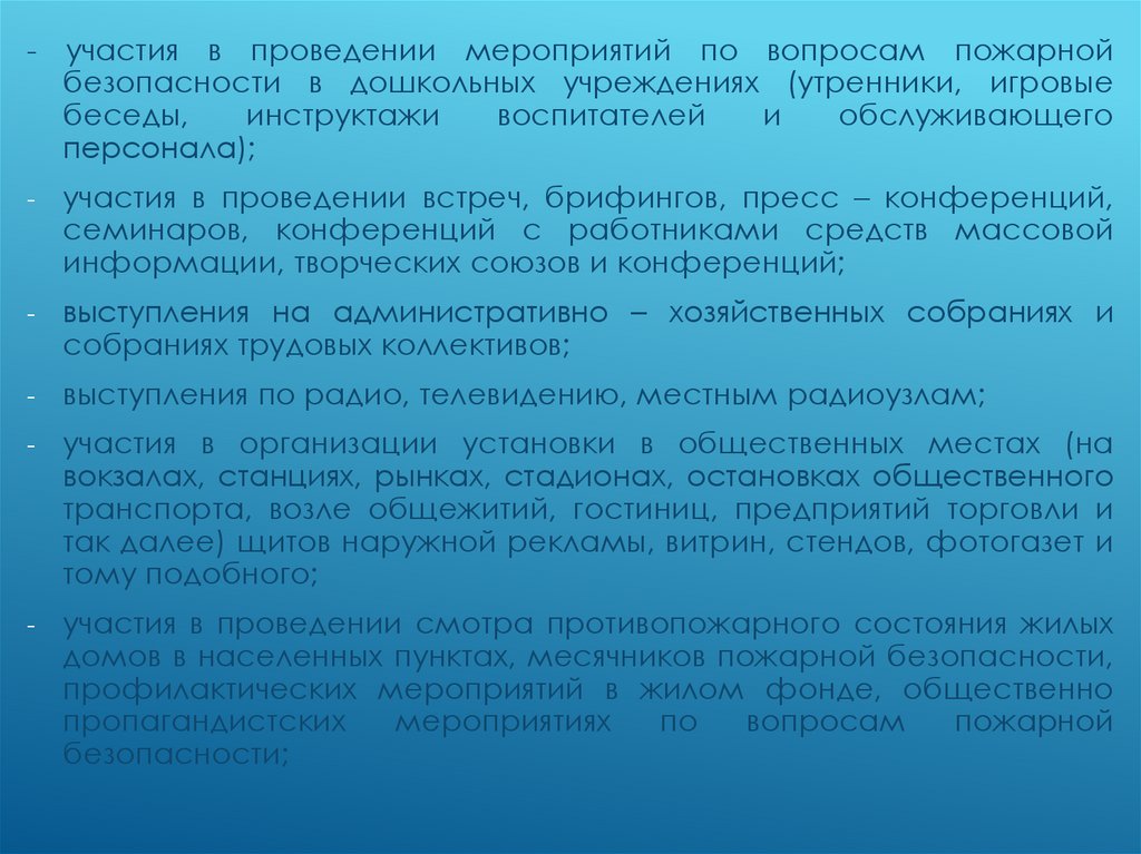 - участия в проведении мероприятий по вопросам пожарнойбезопасности в дошкольных учреждениях (утренники, игровые