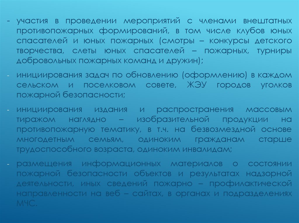 - участия в проведении мероприятий с членами внештатныхпротивопожарных формирований, в том числе клубов юных