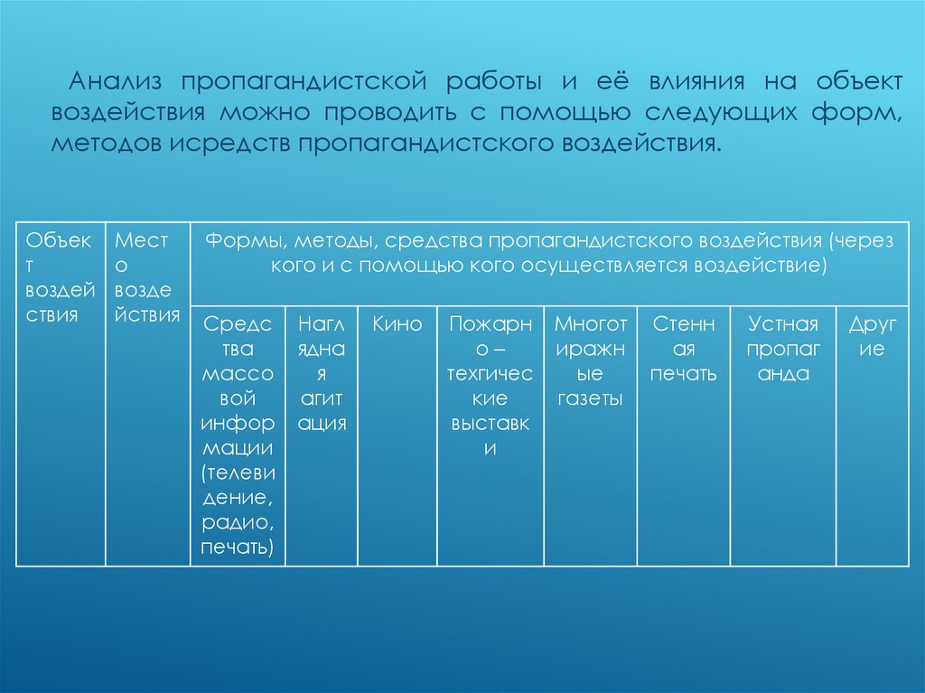Анализ различных форм и методов пропагандистскоговоздействия и используемых для этой цели материалов позволил