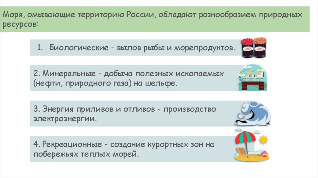 Моря, омывающие территорию России, обладают разнообразием природныхресурсов: