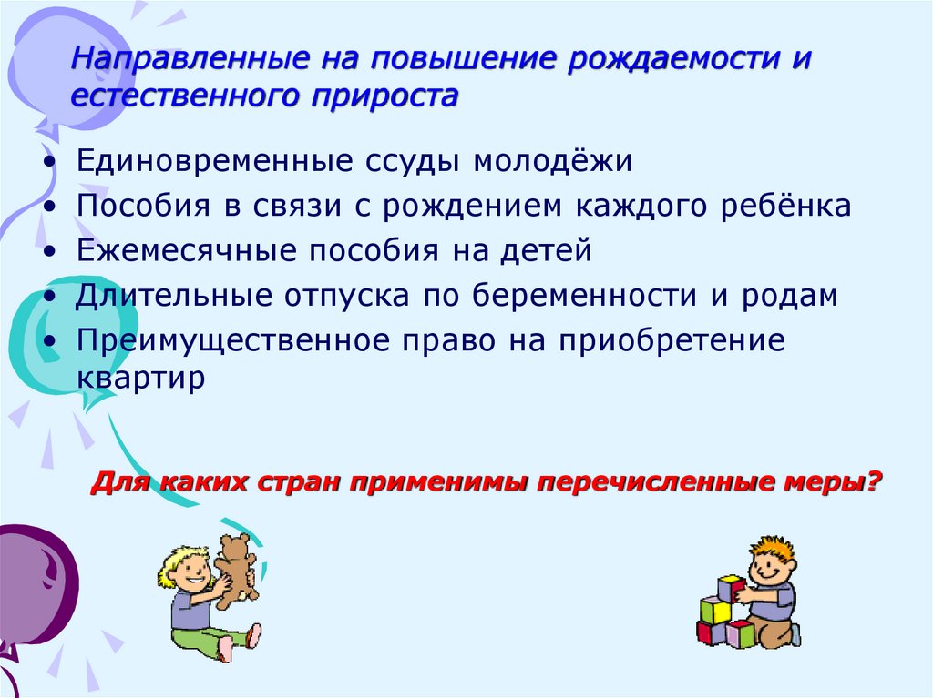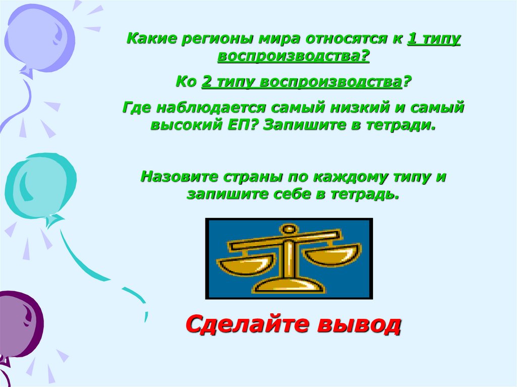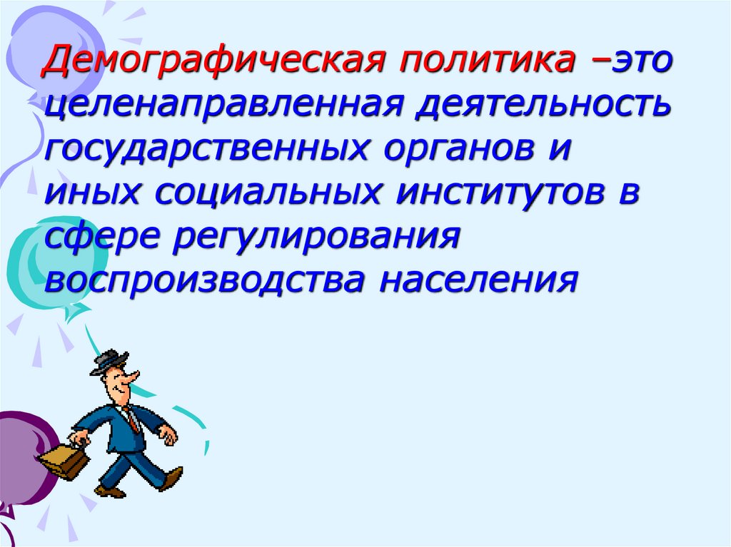 • 2. Подготовить доклады на выбор на темы « Типыдемографической политики» и «Демографическая ситуация в