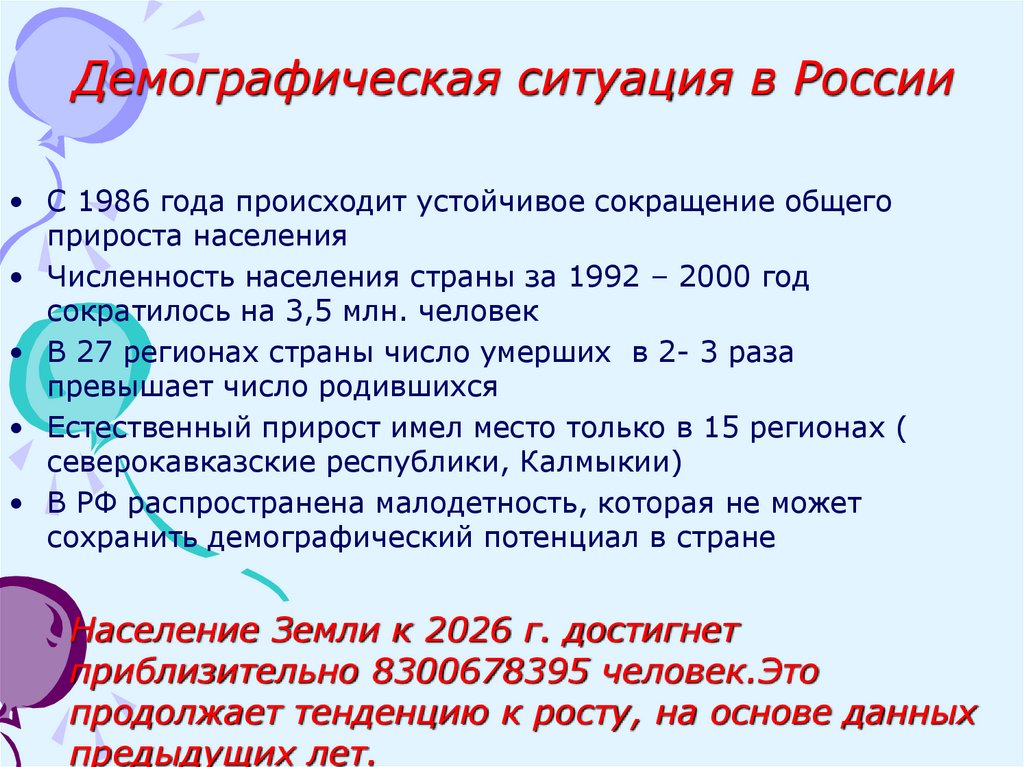 Демографическая ситуация в России• С 1986 года происходит устойчивое сокращение общего