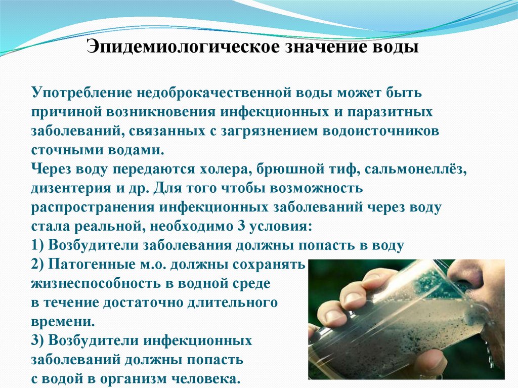 Эпидемиологическое значение водыУпотребление недоброкачественной воды может быть