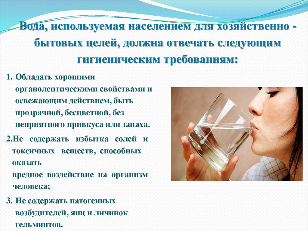 Вода, используемая населением для хозяйственно бытовых целей, должна отвечать следующимгигиеническим требованиям: